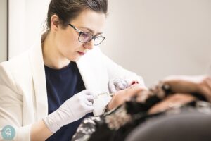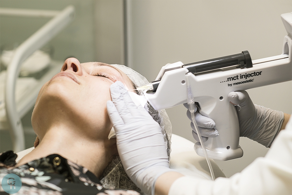 Składową terapii była mezoterapia igłowa, czyli podanie niewielkich dawek odpowiednio dobranego preparatu za pomocą śródskórnych iniekcji. Zabieg poprzedzony był wykonaniem karboksyterapii w obrębie twarzy oraz szyi modelki, ze szczególnym uwzględnieniem okolic oczu.
