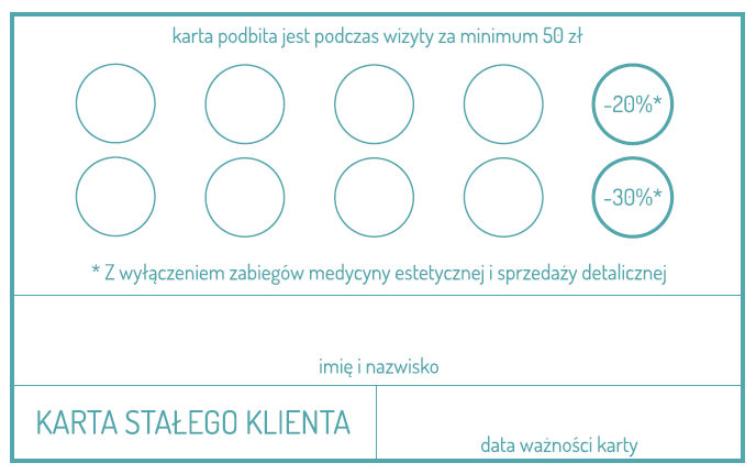 - po 9 wizytach (każda za min. 50 zł) -30% zniżki na dowolny zabieg z oferty gabinetu (za wyłączeniem zabiegów z zakresu medycyny estetycznej oraz sprzedaży detalicznej)