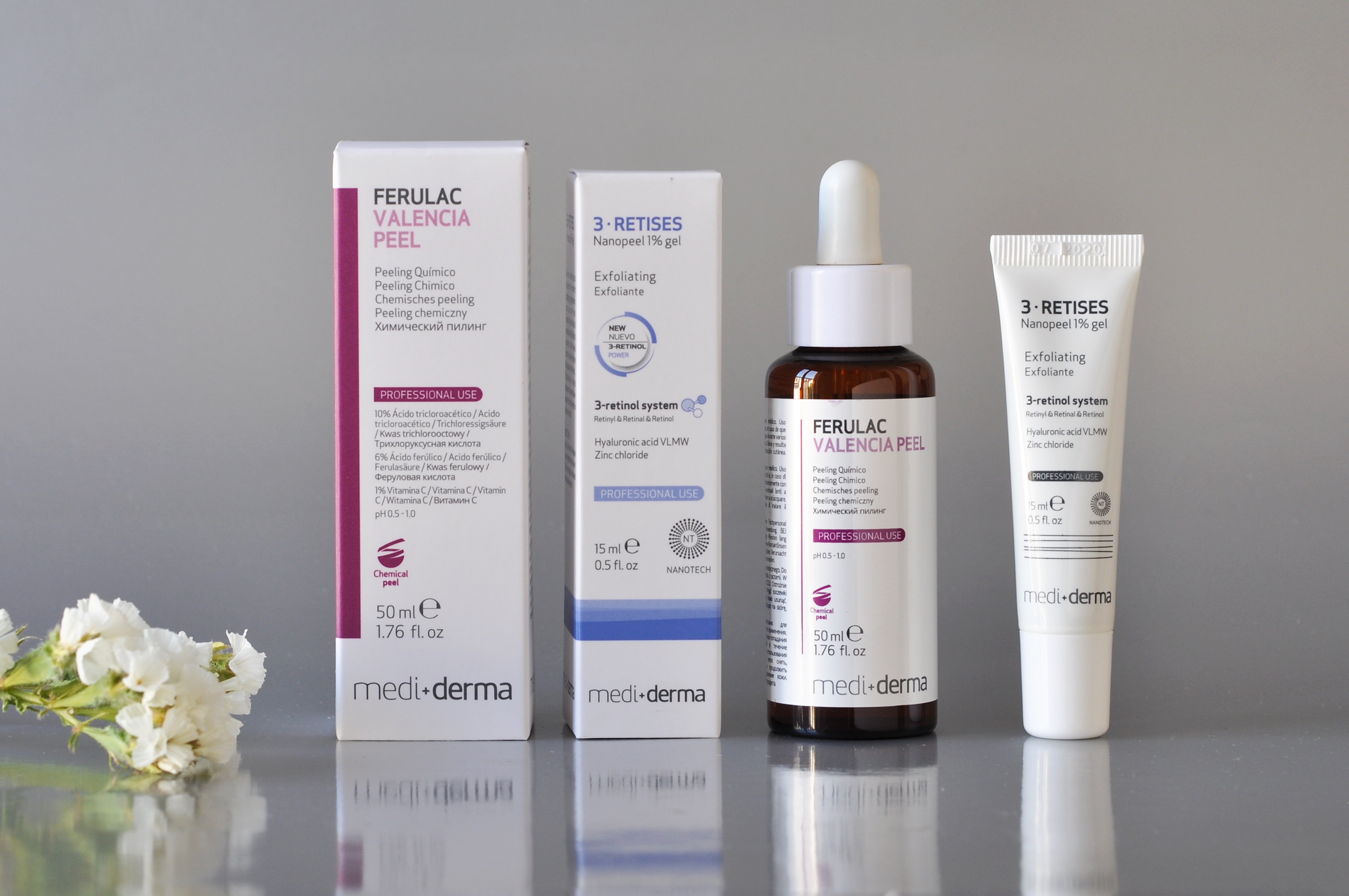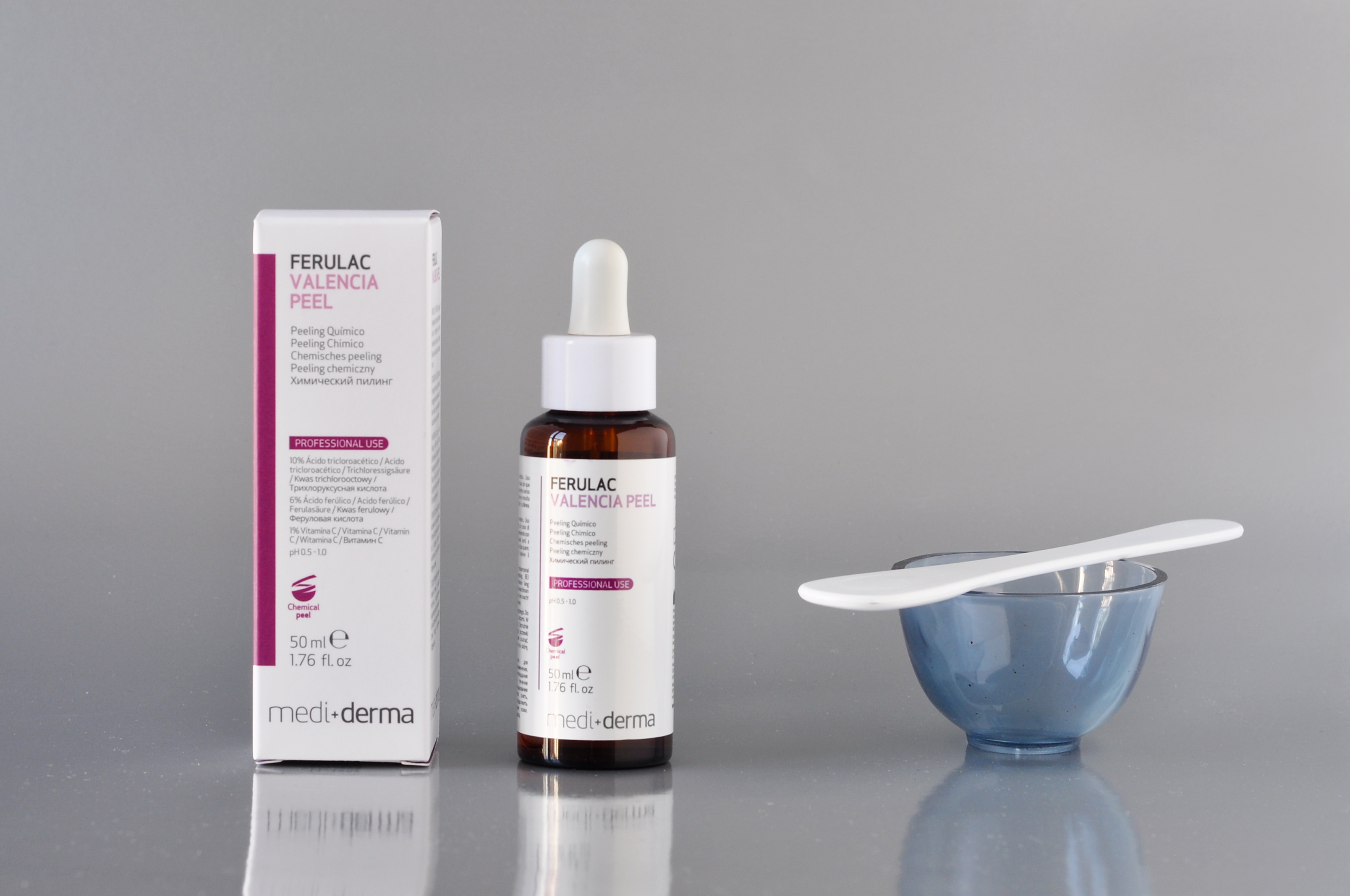 W formule Ferulac VALENCIA PEEL wykorzystano zjawisko synergii 4 kwasów: trójchloroctowego (TCA), ferulowego, salicylowego oraz 3-O-etylo-askorbinowego. Takie połączenie wykazuje bardzo silne działanie przeciwstarzeniowe, inicjując syntezę włókien kolagenowych, elastynowych oraz kwasu hialuronowego, które odgrywają kluczową rolę w utrzymaniu jędrności, elastyczności i nawilżeniu skóry.